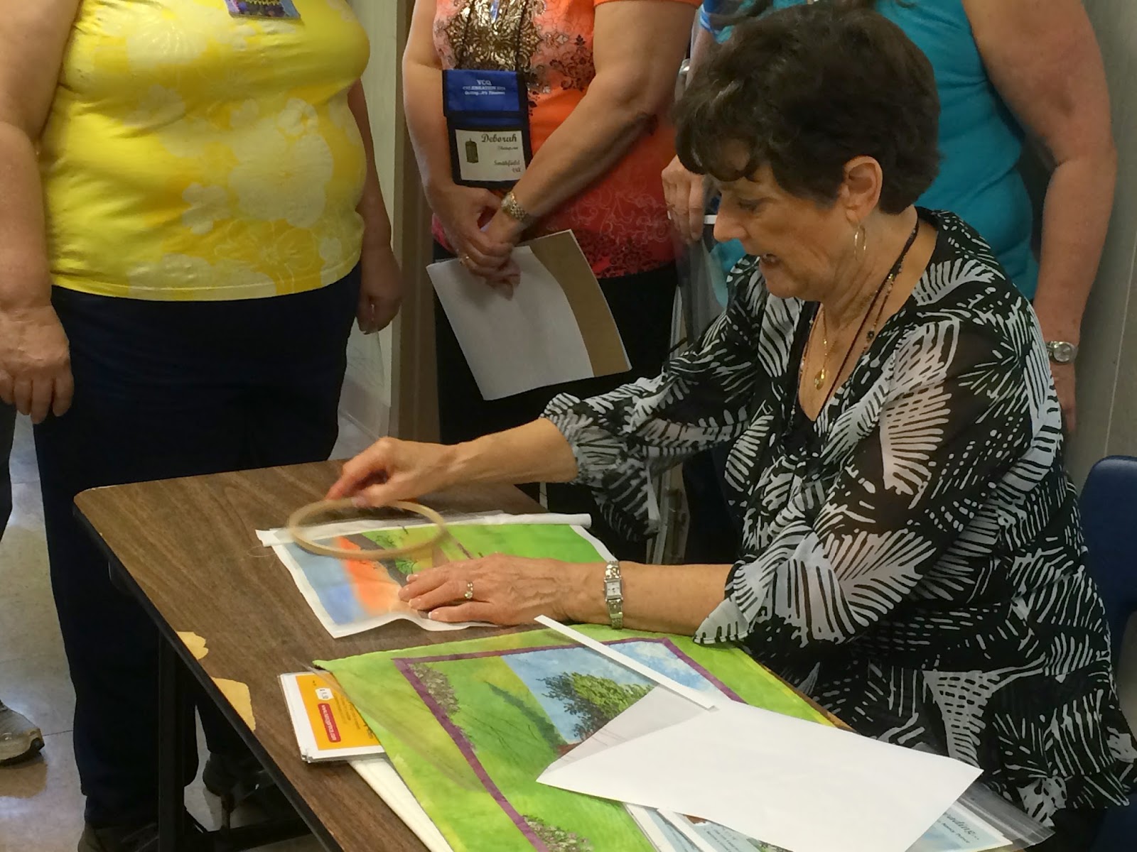 The picture below shows Nancy demonstrating how to hoop the fabric for stitching.